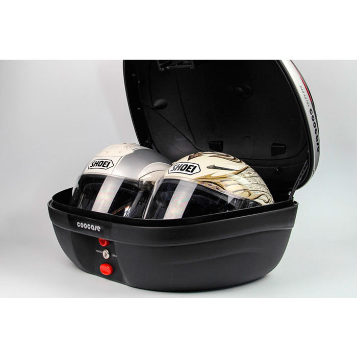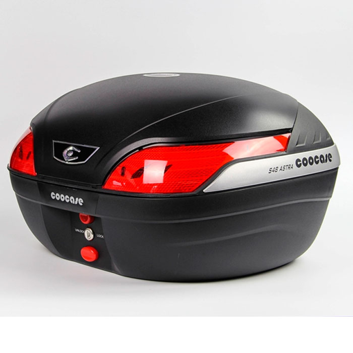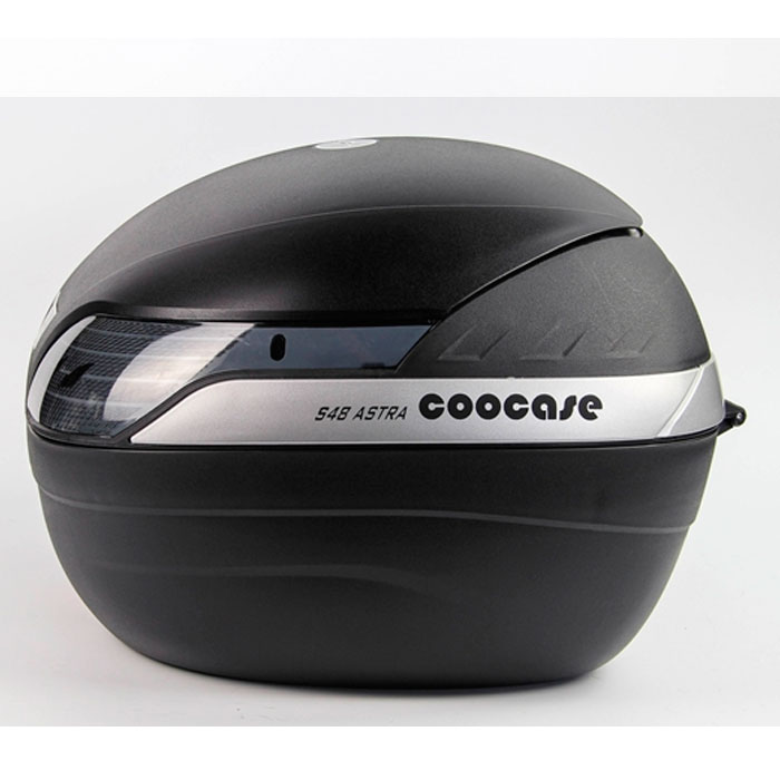 Baúl trasero S48 Astra 48litros capacidad, puedes guardar dos casco en su interior. Marca Coocase, Incluye parrilla universal para la instalación. Elige entre luz Roja o Ahumada