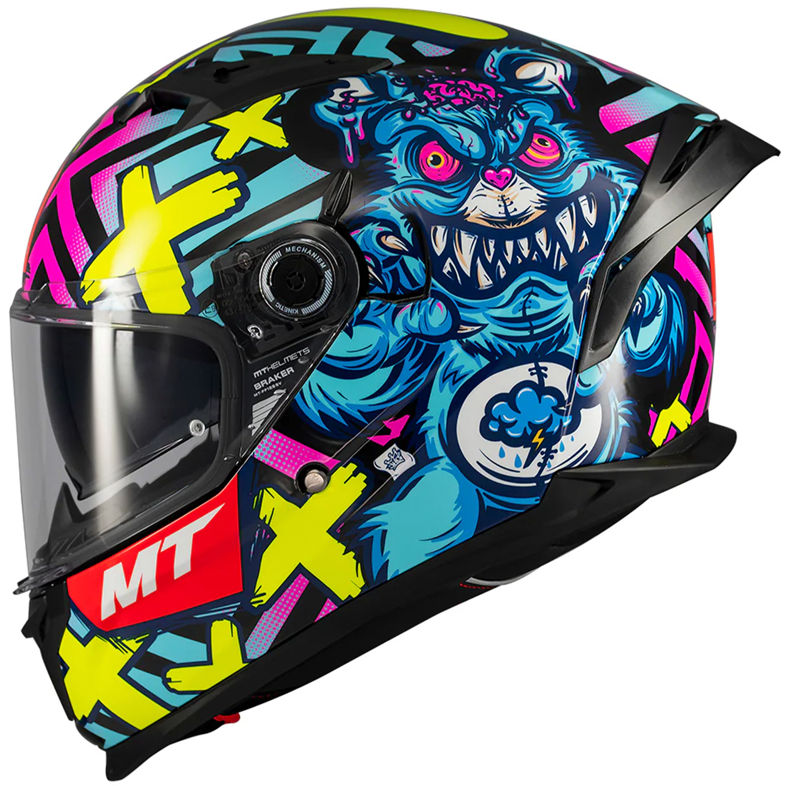 Casco integral de MT modelo Braker SV Crazy Teddy B7 brillo con triple ventilación frontal y alerón posterior con sistema de extracción de aire para favorecer la ventilación interior.