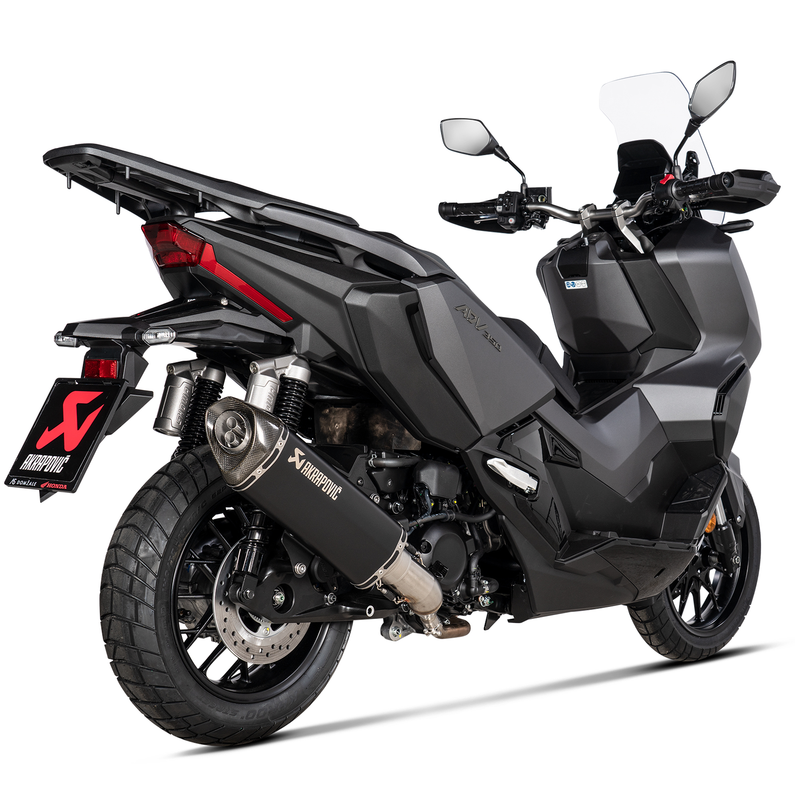 Escape Akrapovic en acero inoxidable negro diseñado específicamente para su instalación en HONDA FORZA / ADV 350 2021-2024. Escape homologado.